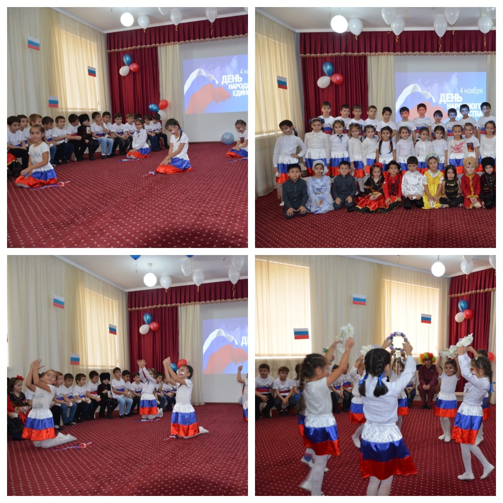 С детьми из подготовительной группы проведено мероприятие «В стране единой». Воспитанники под руководством воспитателей Я.Р.Ахмадовой ., М.Л.Ахматхановой выразили в стихах свое желание жить в мире под ярким и голубым небом. Дети спели песни, читали стихи, станцевали в лезгинку.