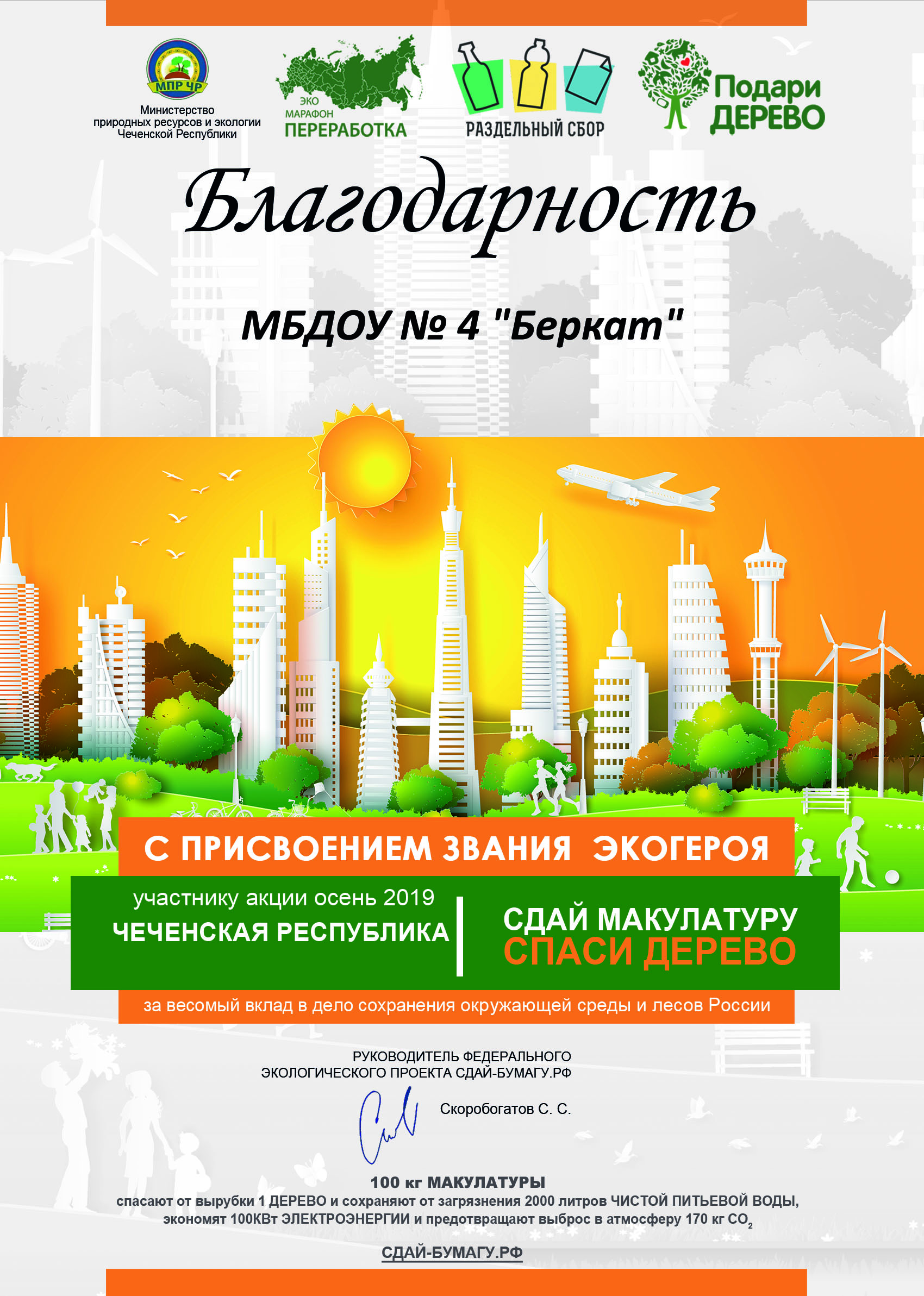 Наш коллектив получил благодарственное письмо, за активное участие в экологической акции "Сдай макулатуру-спаси дерево" в рамках Всероссийского эко-марафона "Переработка"