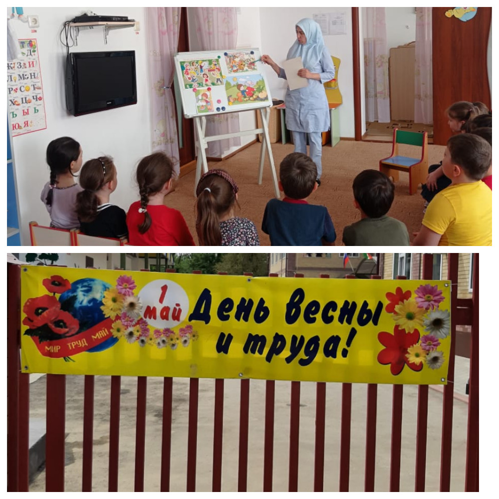 В связи с празднованием Праздника весны и труда, в целях реализации задач по патриотическому воспитанию детей в ДОУ были проведены мероприятия, оформление фасада здания ДОУ баннером и тематические беседы.
