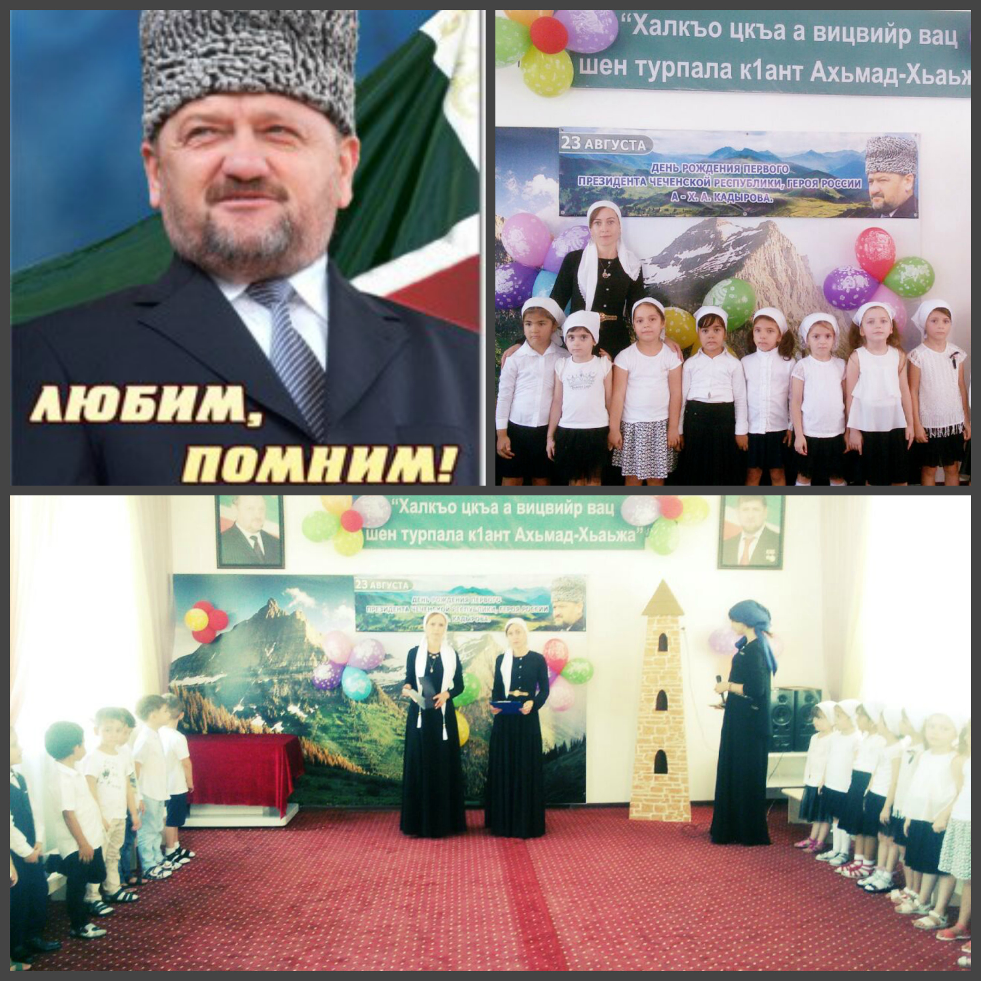 Воспитанники рассказали стихи на чеченском и русском языках о героических страницах жизни и деятельности первого Президента Чеченской Республики, Героя России А.А.Кадырова. Ахмат-Хаджи был патриотом, Для него честь и долг, мужество были не пустые слова, а процветание родной земли – главная цель жизни. Воспитатель рассказала о том , что открыто много детских садов, игровых площадок, детских аттракционов. И это все для детей.